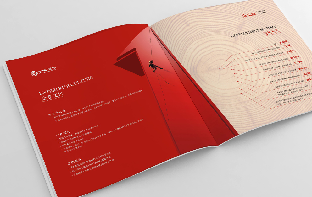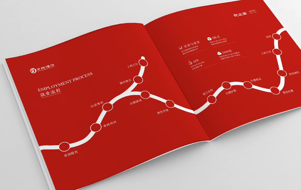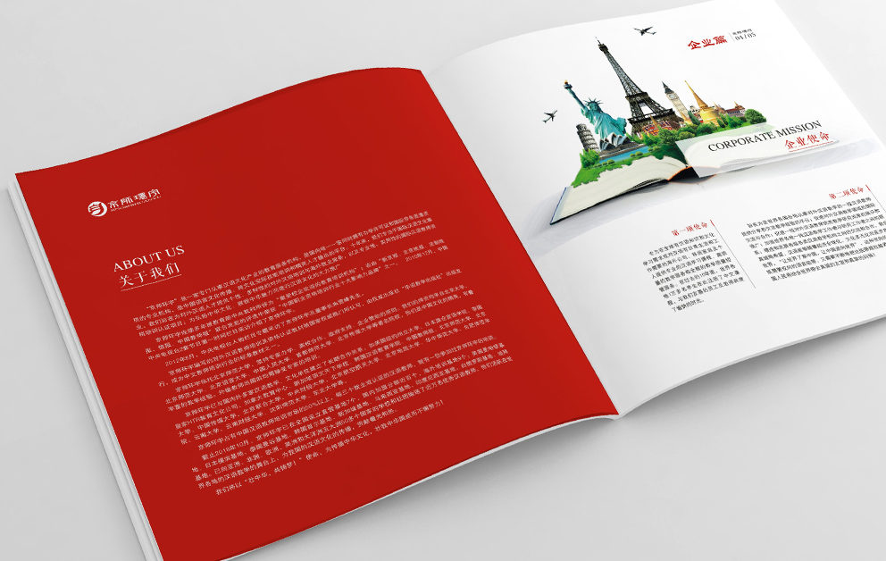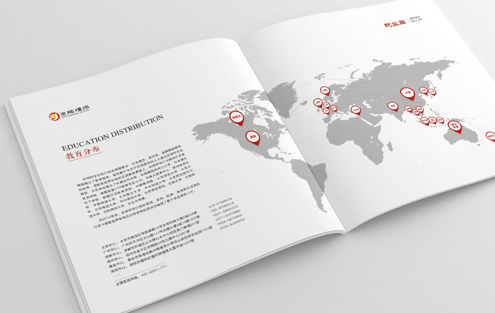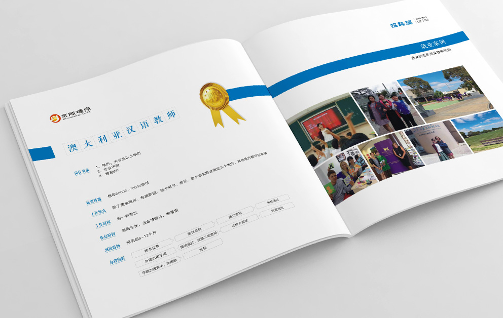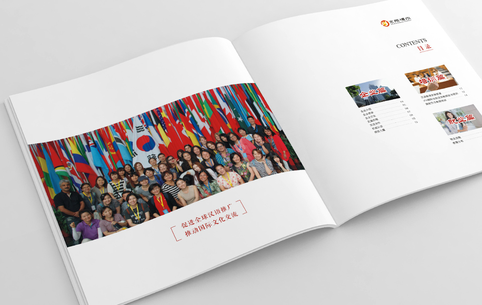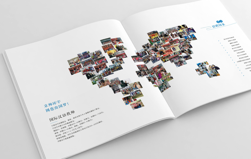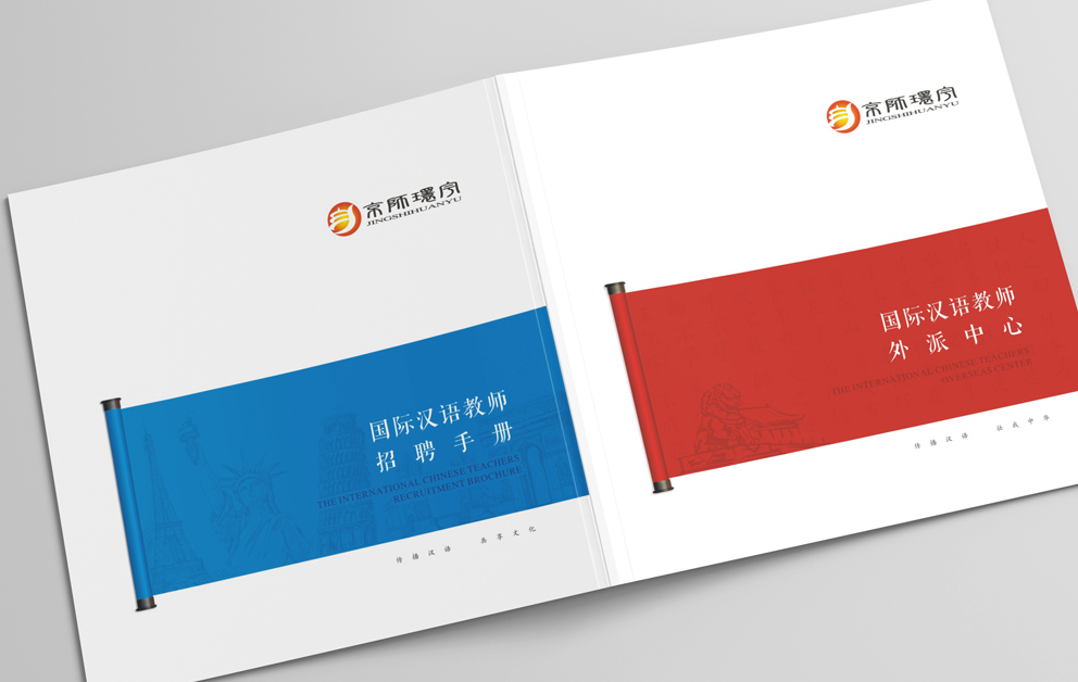 布朗德設計在京師環(huán)宇畫(huà)冊規劃時(shí)根據畫(huà)冊的主體內容進(jìn)行了重新整理,宣傳冊?xún)蓚€(gè)主題,國際漢語(yǔ)教師外派中心和招聘手冊,“國際”固然走向世界,采取了藍色為主由畫(huà)冊從左向右翻閱,漢語(yǔ)教師總部必然采用“中國紅”為主題色,由右向左翻閱,承繼著(zhù)華人自古的翻閱模式。