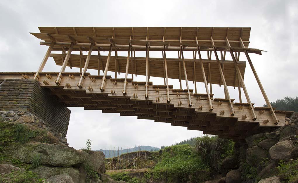 培田村位于福建山區中,2014年洪水將村中的路網(wǎng)毀斷。香港大學(xué)建筑系學(xué)生團隊以傳統工木及數學(xué)技術(shù)結合打造了這座橋梁,同時(shí)它還兼作村子的社區空間。這座橋沒(méi)有使用任何接連件,是當地傳統的嵌合式全木結構。